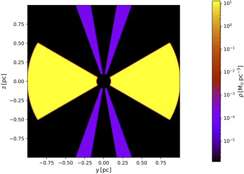 Your basic model specifies a typical configuration for an active galactic nucleus (AGN), namely a central point source surrounded by a torus and a conical shell. Since you are interested in UV polarization, the torus has a role of blocking the central source, while most of the polarization signal is produced by scattering in the cone. The illustration below shows a vertical cut through the medium density distribution. Note the large dynamic range: the cone is about 5 orders of magnitude less dense than the torus.
