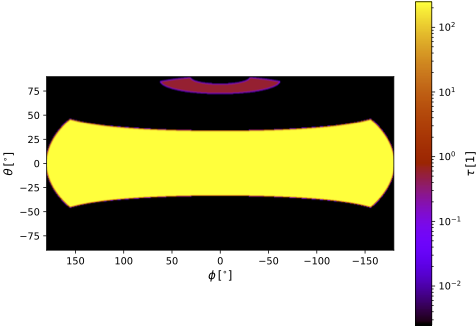 The illustration below shows an all-sky projection of the UV optical depth viewed from the model center. Note that equatorial (edge-on) sight lines show a radial optical depth of